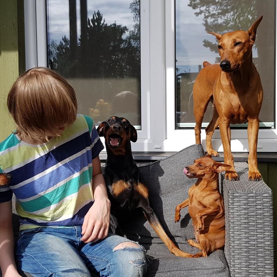 Vår erfarenhet är att det för det allra mesta går mycket bra. MEN har man uppfattningen att barn och hund ska vara lekkompisar, sova ihop och att hunden ska tåla nästan vad som helst så är inte Pinschern den rätta rasen för er.